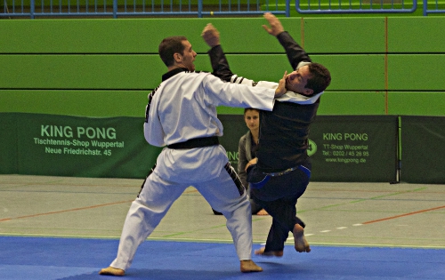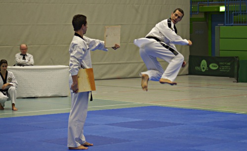 Als zweite Disziplin war Ilbo-Taeryon an der Reihe (wo nun endlich auch Stefan zeigen konnte, dass er den Angriff sehr gut beherrschte, wohlgemerkt links und rechts; und auch mit dem Fuß ;-)). Michi konnte mit einem ausgereiften Programm mit vielen, sauber ausgeführten Sprung- und Drehtechniken überzeugen.