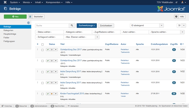 Die Alternative, anstelle der Kategorie (im Beispiel „Abteilung Tischtennis“) den Autor (im Beispiel „Redakteur Tischtennis“) einzustellen, führt zwar dazu, dass alle Beiträge dieses Autors aufgelistet werden, es werden aber weiterhin nur die 3 Knöpfe „Neu„, „Bearbeiten“ und „Hilfe“ angezeigt. Damit fehlen leider einige Möglichkeiten, den Status von Beiträgen zu bearbeiten. Hilfreich ist diese Ansicht jedoch für den Überblick über alle Beiträge eines Autors, egal zu welcher Kategorie sie gehören.