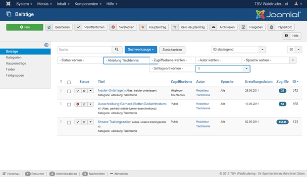Jetzt enthält die Liste nur noch 3 Beiträge (die Beiträge, die sich in Unter-Kategorien der Kategorie „Abteilung Tischtennis“ befinden, werden nicht mehr angezeigt). Und es hat sich auch oben bei den möglichen Aktionen etwas geändert. Zu den 3 Knöpfen „Neu„, „Bearbeiten“ und „Hilfe“ sind noch einige weitere Knöpfe hinzugekommen: „Veröffentlichen„, „Verstecken„, „Haupteintrag„, „kein Haupteintrag„, „Archivieren„, „Freigeben“ und „Papierkorb„.
