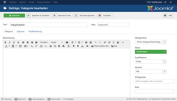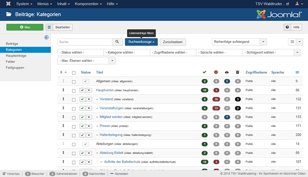 Da ich die Screenshots unter der Kennung des Vereins-Redakteurs gemacht habe und dieser Redakteur die Kategorien und Beiträge des Hauptvereins und aller Abteilungen bearbeiten darf, werden in den obigen beiden Screenshots fast alle Kategorien in blauer Schrift angezeigt. Beim Redakteur einer Abteilung werden nur die Kategorien, die zu seiner Abteilung gehören, in blauer Schrift angezeigt.