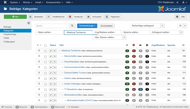 Jetzt enthält die Liste nur noch die Ober-Kategorie „Abteilung Tischtennis“ sowie alle untergeordneten Kategorien. Und auch bei den möglichen Aktionen hat sich etwas geändert: zusätzlich zu den 3 Knöpfen „Neu„, „Bearbeiten“ und „Hilfe“ werden jetzt auch die Knöpfe „Veröffentlichen„, „Verstecken„, „Archivieren“ und „Papierkorb“ angezeigt.