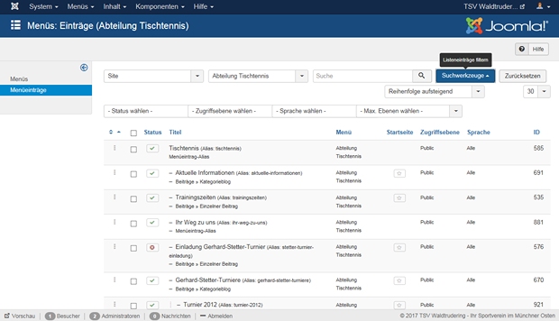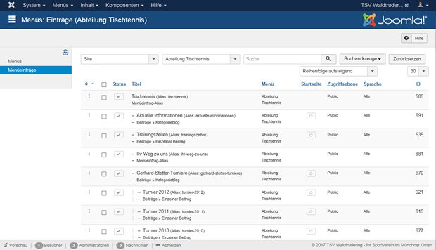 Alle Menü-Namen sind Links auf die Seite mit den Menü-Einträgen des jeweiligen Menüs. Klicke jetzt auf den Namen des für Dich zutreffende Menüs (alternativ kannst Du auch im Menü „Menüs“ das für Dich zutreffende Menü auswählen oder Du klickst links auf „Menüeinträge“ und wählst dann bei „- Manü wählen –“ das entsprechende Menü aus). Du erhältst dann eine Übersicht aller Menü-Einträge des gewählten Menüs, im Beispiel des Redakteurs Tischtennis sieht das wie folgt aus:
