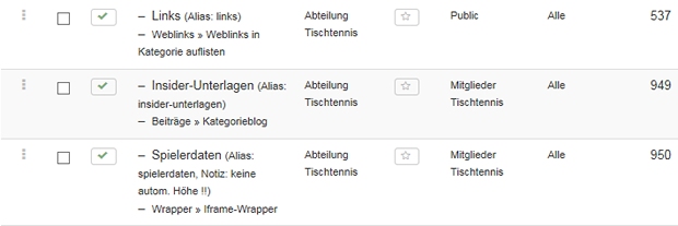 Der Menü-Eintrag „Insider-Unterlagen“ ist interessant, weil bei diesem Menü-Eintrag in der Spalte „Zugriffsebene“ nicht der Standardwert „Public“ zu finden ist, sondern der Wert „Mitglieder Tischtennis“. Das bedeutet, dass diese Seite nur für registrierte Besucher nach Anmeldung zugänglich ist, sofern sie als Mitglieder der Abteilung Tischtennis gekennzeichnet sind.