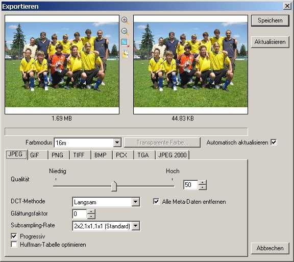- Wähle falls notwendig den Tab „JPEG“ aus. Aktiviere die Boxen bei „Automatisch aktualisieren“, „Alle Meta-Daten entfernen“ und „Progressiv“. Die Einstellungen bei „Farbmodus“, „DCT-Methode“, „Glättungsfaktor“ und „Subsampling-Rate“ solltest Du wie oben zu sehen einstellen.