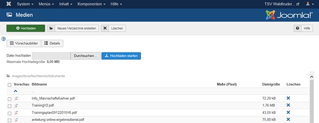 Du lädst die Videodatei über die Joomla Medienverwaltung in ein geeignetes Verzeichnis, das zu Deinem Zuständigkeitsbereich gehört (am besten legst Du dafür ein eigenes Verzeichnis unterhalb Deines Unter-Verzeichnisses unter „tsvw“ an). Falls Du mit der Größenbeschränkung beim Hochladen Probleme hast, dann melde Dich bitte bei mir.