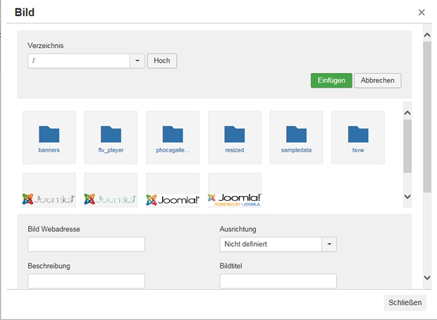 Auf der linken Seite siehst Du unter „Medienverzeichnisse“ sämtliche Unterverzeichnisse in der Medienverwaltung, und da auch die Verzeichnisse der Phoca Gallery hier angelegt sind, ist die Liste sehr lang und schlecht für die Navigation geeignet. Ich empfehle Dir deshalb, die Medienverzeichnisse auszublenden (über das Pfeilsymbol rechts oberhalb von „Medienverzeichnisse„), die Navigation innerhalb der Joomla Medienverwaltung ist auch über die Symbole im rechten Bereich möglich.
