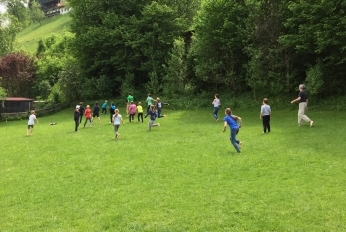 Der Samstag wartete mit einer anstrengenden Schnitzeljagd im bergigen Gelände auf. Nach dem Mittagessen traten die Trainer gegen Kinder im Garten an mit Fussball, Fangen und einigen anderen Spielen. Auch die eine oder andere Zecke wurde zielsicher aufgelesen. Dann kam der ungeliebte Teil: ab unter die Dusche….Nach einiger Überzeugungsarbeit kamen dann alle frisch gewaschen an den mit Grillgut gedeckten Tisch – der Salat hatte diesmal etwas das Nachsehen.